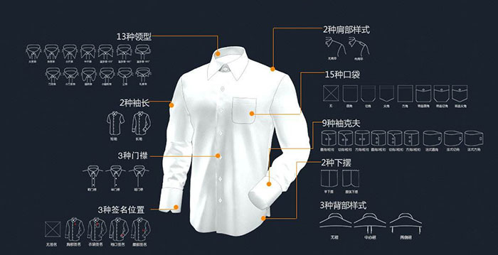 定制襯衫可以自行選擇自己喜歡或所需的面料,款式也可以進行任意的設(shè)計,紐扣、門襟、袖扣等都可以按要求制作。