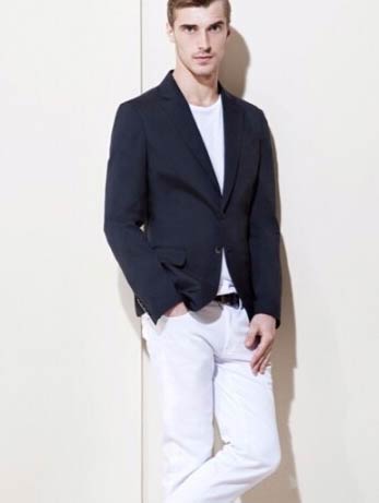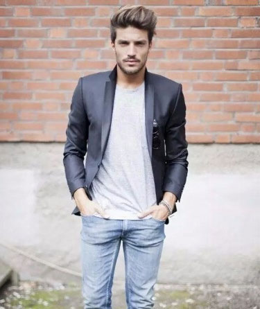 3、休閑西裝外套+淺色t恤+水洗牛仔褲。這是比較輕松休閑的搭配方式,內(nèi)穿淺色t恤,搭配一條水洗牛仔褲,外套深色休閑西裝外套,適合春秋時(shí)節(jié)穿著。