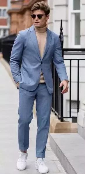 搭配二、在日常生活中大家就不用那么干練了,打扮的隨意一點休閑一點就能夠給人一種隨和的感覺。此時,大家在用高領羊毛衫搭配西服的時候就選擇一套休閑西服套裝然后再搭配同色系的高領羊毛衫就可以了。因為是休閑的搭配,大家在選擇鞋子的時候也不用太正式,選擇一雙可以和身上搭配相似的休閑鞋就可以了。休閑的西服套裝搭配高領羊毛衫,能夠凸顯出你的獨特品味。