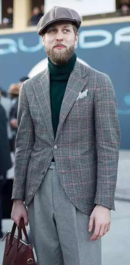 搭配三、如果大家想要搭配出一種復古的感覺就可以選格紋西服套裝與高領羊毛衫一起搭配。因為格紋西服本身就會有一種復古風味,此時大家再搭配一件高領羊毛衫簡直是帥到掉渣。不過,在選擇高領羊毛衫的時候一定不要選擇哪些死氣沉沉的顏色,要嘗試一些有色彩的高領羊毛衫,要注意整體和諧的色調(diào)和層次感,風格上還會更顯年輕,這樣搭配的復古感覺會非常好。