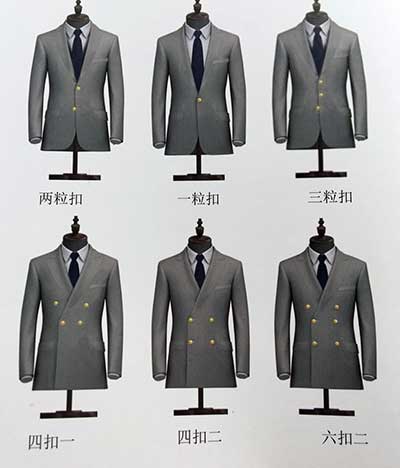 西裝的基本款型包括單排扣和雙排扣。其中單排扣最常見的是兩粒扣,還有一粒扣和三粒扣,一般兩粒扣只扣上面的一顆扣,三粒扣只扣上面的兩顆扣。雙排扣包括四粒扣、六粒扣和八粒扣,其中四粒扣又分為四扣一和四扣二,六粒扣一般是六扣二,八粒扣一般是八扣三。雙排扣款型會使身型看起來更具分量和厚實,也會顯得更加隆重,多用于較正式的場合。